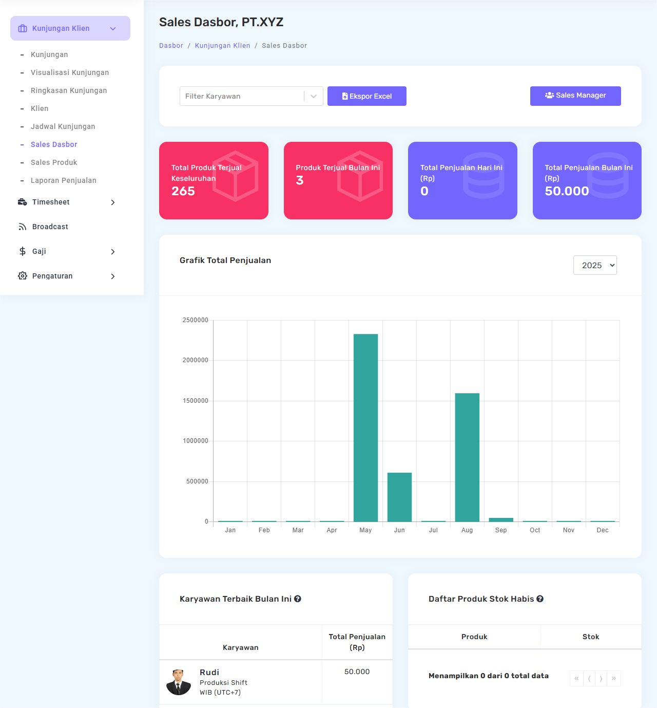Fitur Sales Dasbor digunakan untuk memantau aktivitas penjualan setelah karyawan melakukan kunjungan klien.