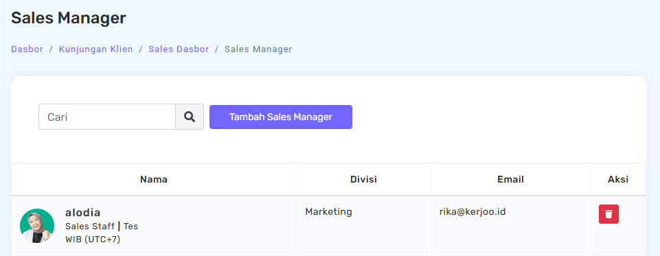 Menu ini digunakan untuk menambahkan Sales Manager, yaitu leader yang bertugas mengelola tim lapangan. Sama seperti admin, Sales Manager memiliki akses penuh ke menu Kunjungan Klien dan dapat memantau aktivitas tim secara menyeluruh.
