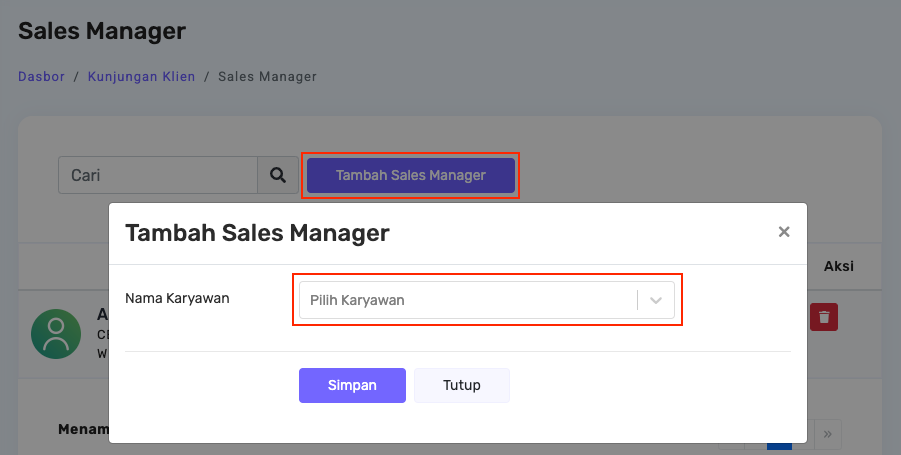 Jika terdapat lebih dari satu supervisor, Sales Manager juga bisa menambahkan Sales Manager baru. Cukup klik tombol Tambah Sales Manager, lalu pilih nama karyawan dari daftar yang tersedia.