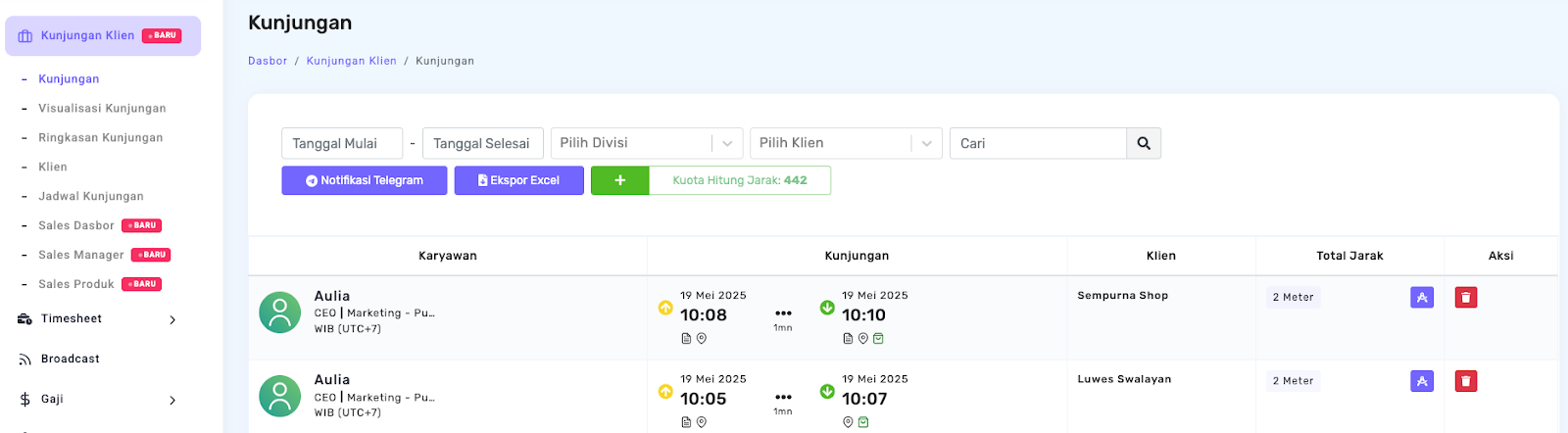 Panel Kunjungan menampilkan gambaran lengkap aktivitas kunjungan klien yang telah dilakukan karyawan.