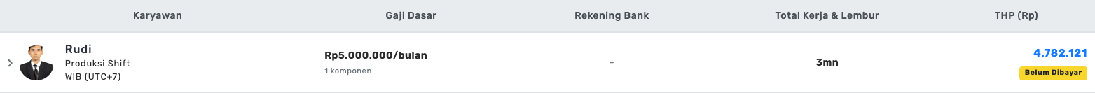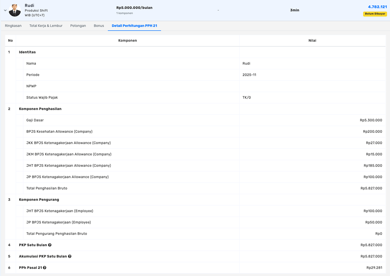 Rincian kehadiran karyawan juga ditampilkan secara otomatis sesuai periode penggajian.