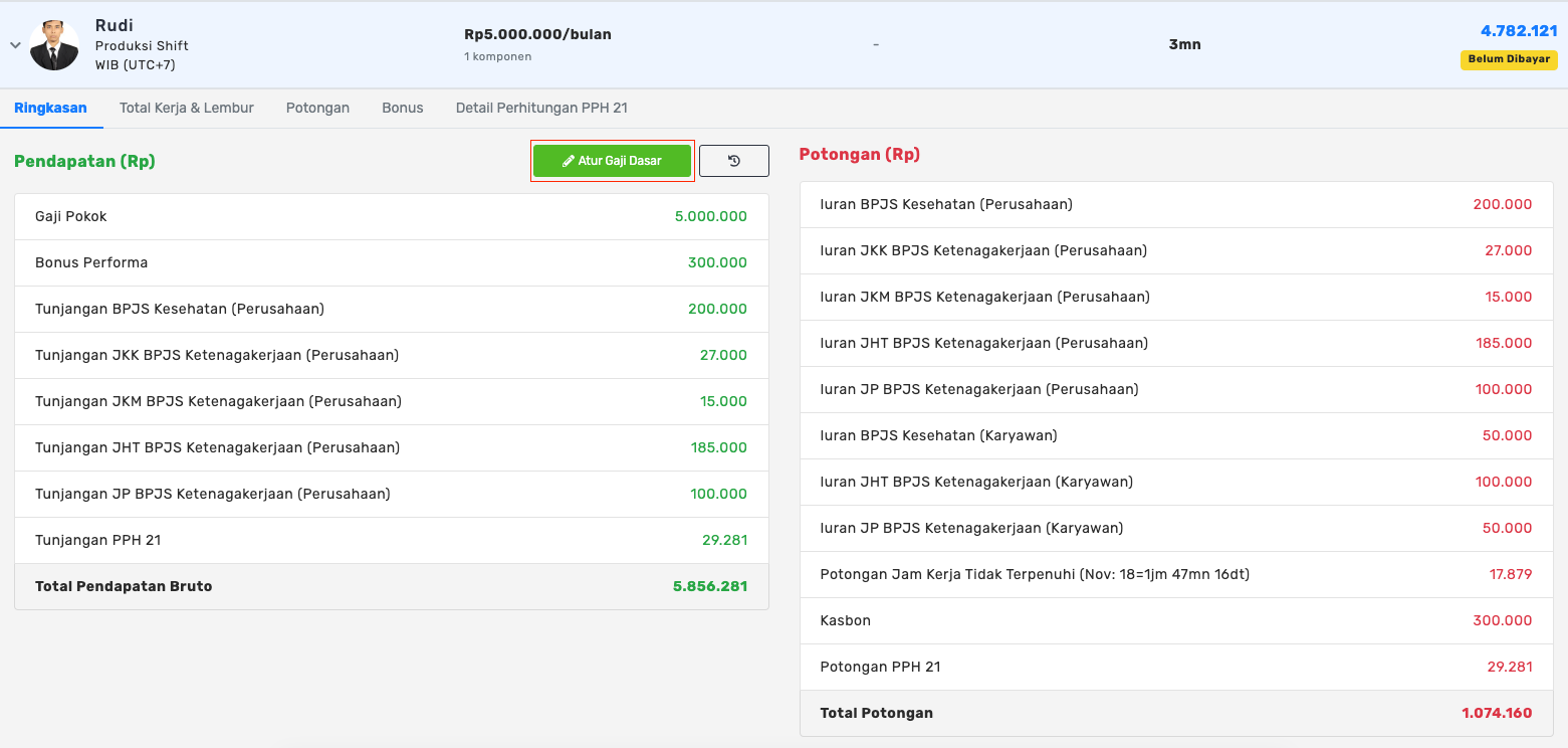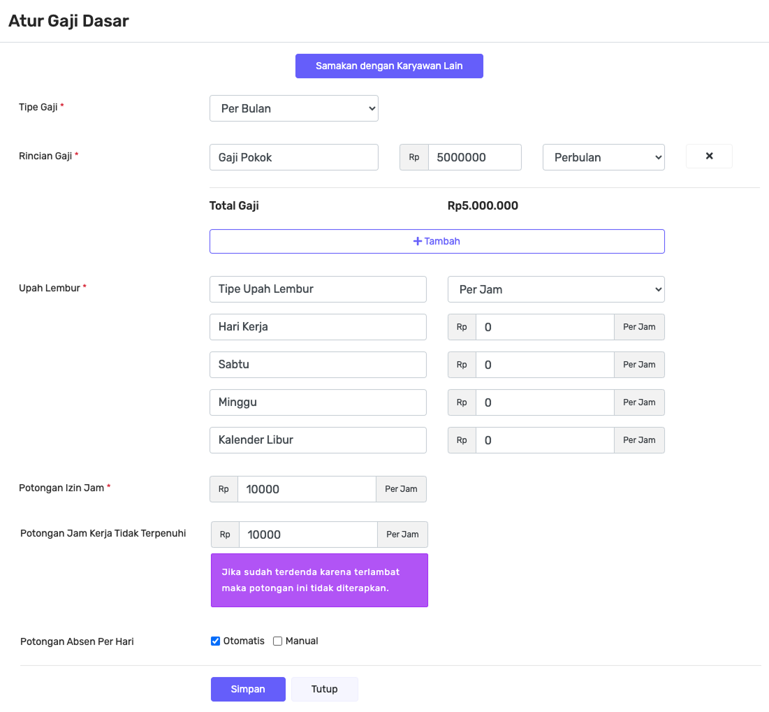 Pada bagian Ringkasan, akan ditampilkan Tunjangan BPJS yang persentasenya dibayarkan oleh perusahaan. Di bagian ini, perusahaan juga dapat mengatur Gaji Dasar, termasuk memilih Tipe Gaji (per jam, per hari, atau per bulan). Selain itu, tersedia pengaturan untuk Rincian Gaji, Upah Lembur, Potongan Izin/Jam, Potongan Jam Kerja Tidak Terpenuhi, serta pengaturan apakah potongan per hari akan dihitung otomatis atau manual.
