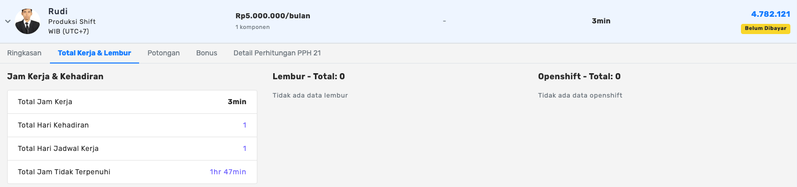 Bagian ini menampilkan total jam kerja dan kehadiran karyawan serta akumulasi lembur atau openshift yang tercatat selama periode penggajian.