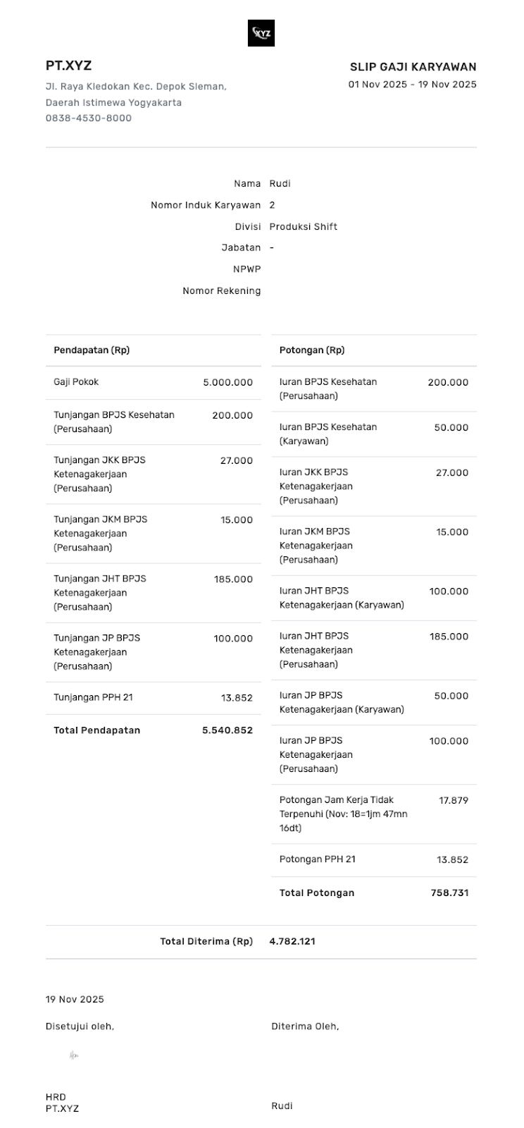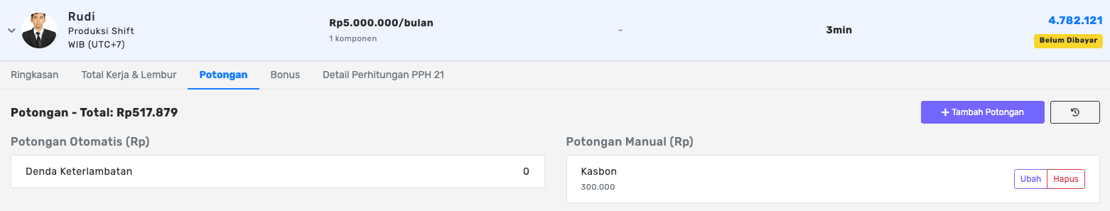 Bagian ini menampilkan total potongan karyawan, yang terdiri dari potongan otomatis berdasarkan aturan perusahaan serta potongan manual yang dapat ditambahkan secara langsung sesuai kebutuhan.