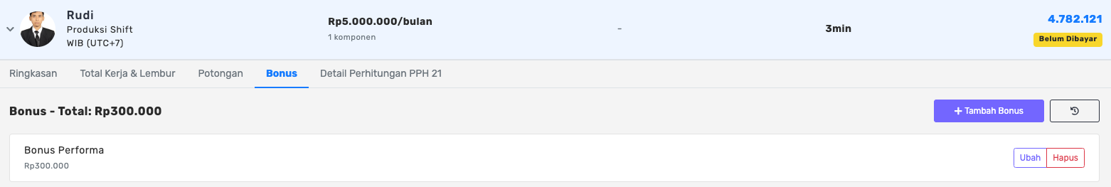 Bagian ini menampilkan total bonus karyawan dan memungkinkan perusahaan menambah, mengubah, atau menghapus bonus secara manual sesuai kebijakan yang berlaku.